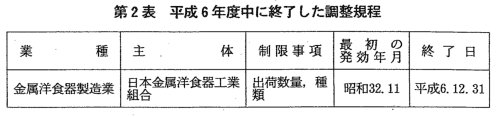 | 中小企業団体の組織に関する法律に基づき商工組合が安定事業又は合理 化事業を行う場合には,調整規程を設定し,主務大臣の認可を受ける必要 があり,主務大臣はその認可に際して当委員会に協議等をしなければなら ないこととなっている。 本年度において,主務大臣から協議等を受けたものはなく,また,同法 に基づき唯一実施されていた日本金属洋食器工業組合の安定事業に係る調 整規程が期限到来をもって終了した(第2表)。これにより,同法に基づ く調整規程は全廃された。