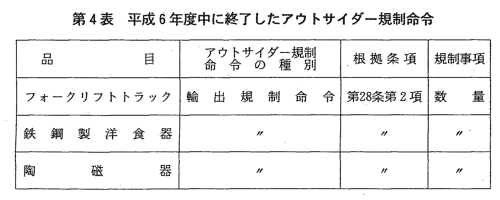 | 本年度において,輸出入取引法に基づき新規に設定されたカルテルはな く,本年度中に終了したカルテルは7件であり,本年度末現在における同 法に基づくカルテルの件数は12件となっている(第3表)。 ![]() また,本年度において新規に定められたアウトサイダー規制命令はな く,終了したアウトサイダー規制命令は3件であり(第4表),本年度末現 在におけるアウトサイダー規制命令の件数は4件となっている。
