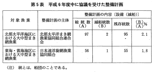 | 漁業再建整備特別措置法は,政令で定めた業種に係る漁業協同組合等の 団体が行う漁船の隻数の縮減等の整備計画について農林水産大臣が同法第 6条第1項の規定に基づき認定しようとするときは,同法第16条の規定に 基づき当委員会に協議しなければならないこととしている。 本年度においては,大中型まき網漁業の整備計画に関し,農林水産大臣 から協議を受けた。これに対し,当委員会は,所要の調査を行った結果, 特に問題はないと認め,異議のない旨回答した(第5表)。なお,当該整 備計画は本年度中に終了した。