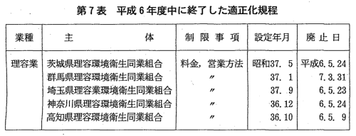 | 環境衛生関係営業の運営の適正化に関する法律に基づき環境衛生同業組 合が適正化事業を行う場合には,環境衛生同業組合連合会の設定する適正 化基準に準拠して適正化規程を設定し,厚生大臣又は都道府県知事の認可 を受ける必要があり,厚生大臣又は都道府県知事はその認可に際して当委 員会に協議しなければならないこととなっている。また,環境衛生同業組 合が同規程を廃止したときは,厚生大臣又は都道府県知事に届け出る必要 があり,厚生大臣又は都道府県知事はその届出があったときは当委員会に 通知しなければならないこととなっている。 本年度においては,厚生大臣又は都道府県知事から協議を受けたものは なく,通知を受けたものは適正化規程廃止に係る5件である。 同法に基づく適正化規程は理容業の1業種のみであり,各都道府県の理 容業の環境衛生同業組合によって36件設定されていたが,本年度におい て,このうち5件の適正化規程が廃止されたことから,本年度末現在にお ![]() ける同法に基づく適正化規程の件数は31件となった(第7表)。 なお,適正化規程の基本となる適正化基準は,本年度末現在,理容業の ほか,美容業及びクリーニング業について存続している。 |