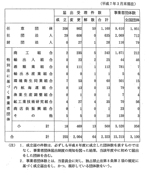 根拠法別事業者団体届出受理件数及び事業者団体数