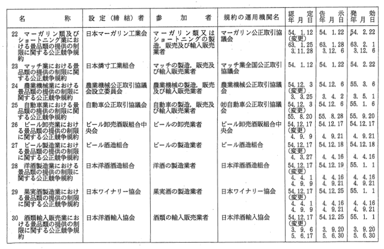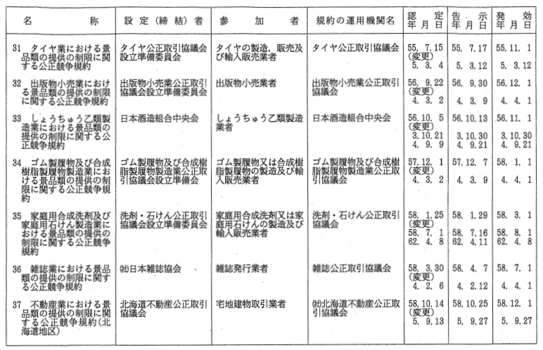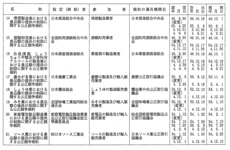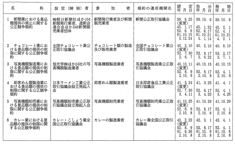 景品関係公正競争規約一覧
