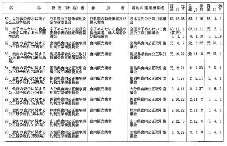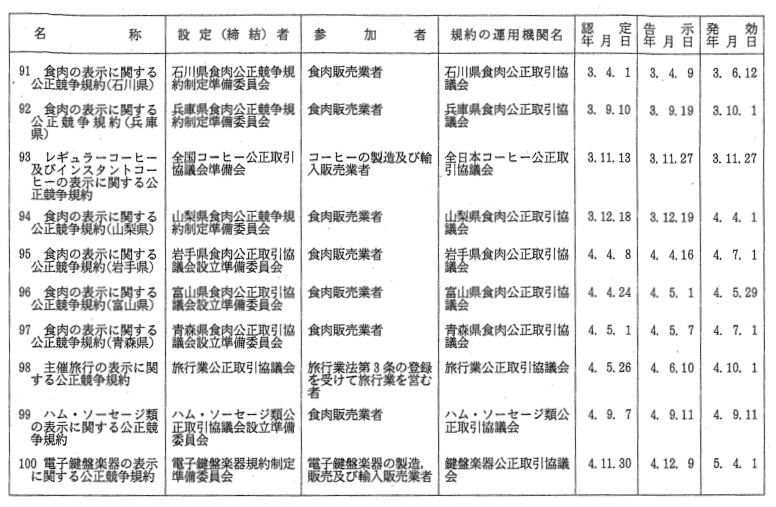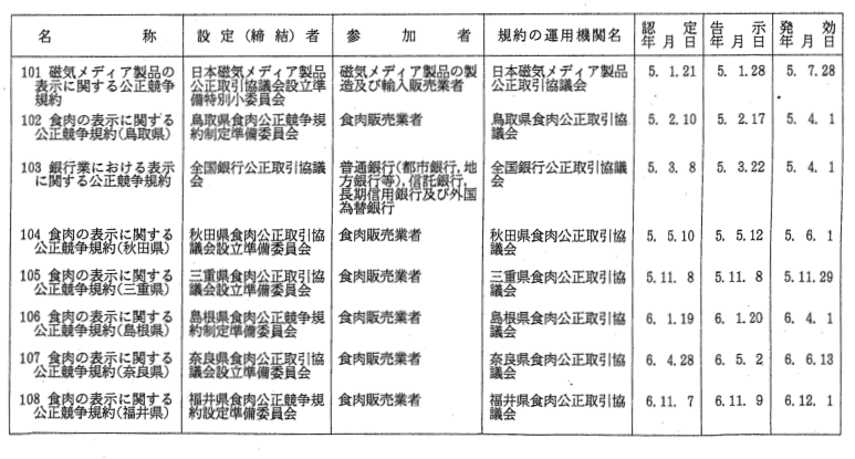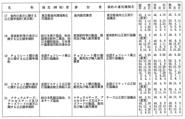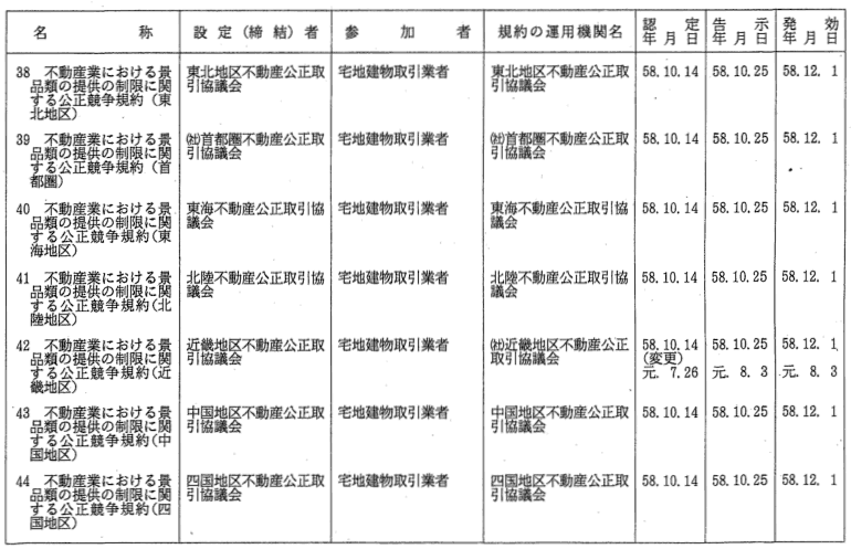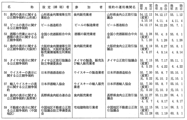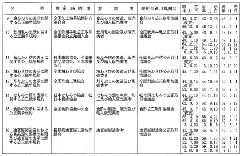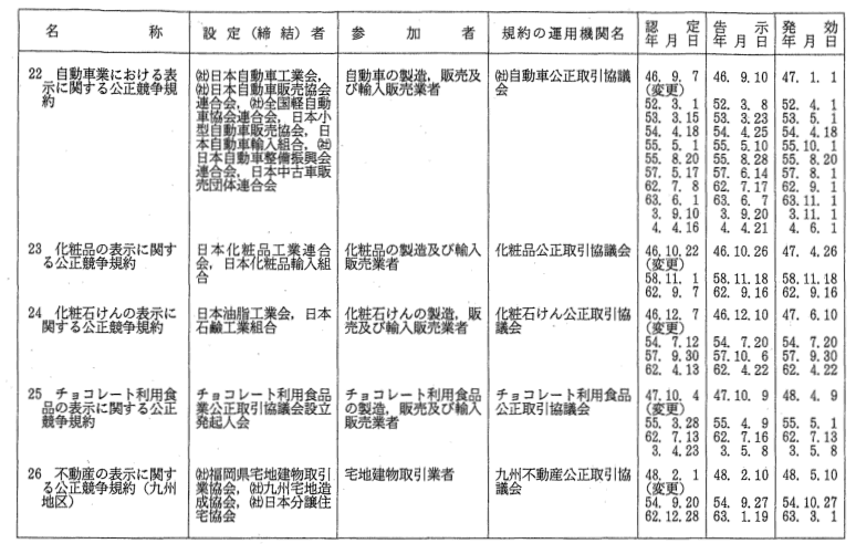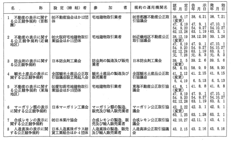 表示関係公正競争規約一覧