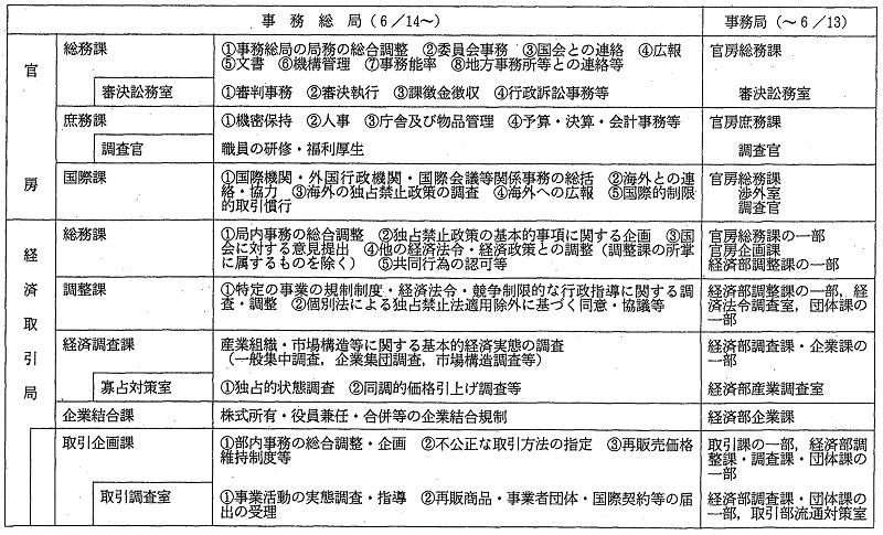 | (1) | 平成8年6月14日に当委員会の組織強化等に係る独占禁止法改正法が 公布・施行されたことに合わせて,内部組織の抜本的再編成を行うた め,公正取引委員会事務局組織令等当委員会の組織に関連する政令,総 理府令,公正取引委員会規則も改正された。 一連の法令の改正後の公正取引委員会及び公正取引委員会の事務総局 の組織の準拠法規は,独占禁止法第27条第1項(委員会の設置),第27 条の2(委員会の所掌事務),第29条第1項(委員会の組織),第35条 (事務総局の設置)及び第35条の2(地方事務所及び支所の設置)の各 規定であり,事務総局の組織及び所掌事務,地方事務所及び支所の名 称,位置,管轄区域等については,公正取引委員会事務総局組織令,公 正取引委員会事務総局組織規則及び公正取引委員会事務総局組織規程に 規定されている。 一連の法令の改正後の公正取引委員会事務総局の組織及び所掌事務は 1-2表のとおりである(審判官及び地方事務所・支所を除く。)。ま た,地方事務所・支所の管轄区域は以下のとおりである。