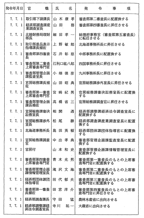 | (2) | 当委員会は,独占禁止法第29条第1項の規程により委員長及び委員4 人をもって組織することとされている。また,公正取引委員会事務総局 の職員の定員は,行政機関の職員の定員に関する法律(昭和44年法律第 33号)第2条の規程に基づく行政機関職員定員令(昭和44年政令第121 号)第1条第2項の表に定められている。 平成7年度においては,平成7年3月に行政機関職員定員令の一部改 正(平成7年政令第82号)が行われ,公正取引委員会事務局の職員の定 員は,520人(平成6年度506人)と定められた。 なお,同定員令は,平成8年5月に一部改正(平成8年政令第112 号)され,平成8年度における公正取引委員会事務局(注)の職員の定 員は534人となり,平成7年度に比べ14人増加した。