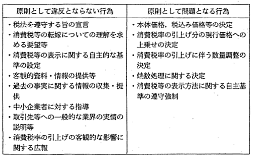 | 当委員会は,事業者や事業者団体が消費税の適正かつ円滑な転嫁のため にどのような行為を独占禁止法に違反することなく行えるかについて具体 的かつ分かりやすく示すこと等により,独占禁止法違反行為等の未然防止 を図るとともに,消費税率引上げ後の消費税等の適正かつ円滑な転嫁に資 することを目的として,平成8年12月25日,「消費税率の引上げ及び地方 消費税の導入に伴う転嫁・表示に関する独占禁止法及び関係法令の考え 方」を作成・公表した。 |