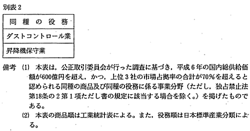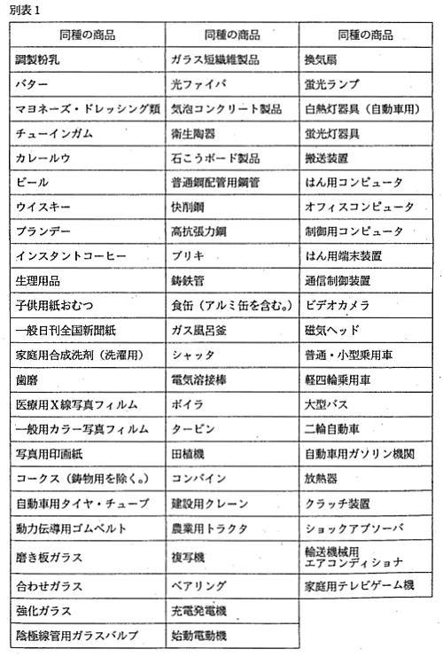 業分野が別表に掲載され,粉乳,鋼矢板,エレベータなど17事業分野が別表