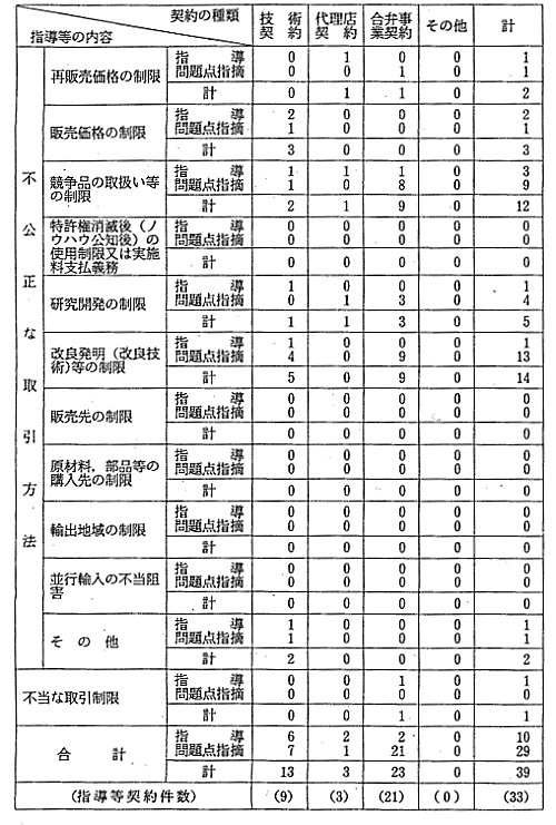 | 2 | 主要な契約の種類別に指導等の状況をみると,技術契約の指導等の件数 は,契約件数では9件で,代理店契約の指導等の件数は,契約件数は3件 で,合弁事業契約の指導等の件数は,契約件数では21件となっている。 |