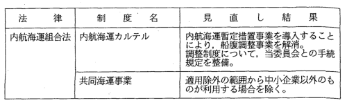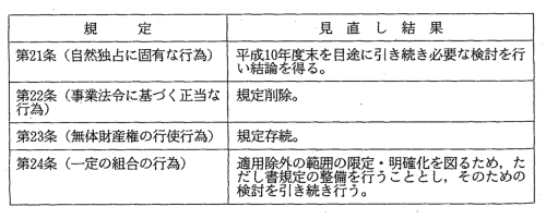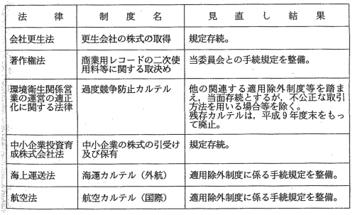 | 再改定計画に基づき,独占禁止法に基づく適用除外制度,適用除外法に 基づく適用除外制度及び引き続き検討することとされていた個別法に基づ く適用除外制度についてそれぞれ見直しを行ってきたところ,その結論が 「規制緩和推進3か年計画」(以下「新計画」という。)に盛り込まれた。 新計画においては,「独占禁止法適用除外カルテル等制度については, 適用除外となる行為及び団体の全範囲について見直しを行ったが,その結 果は以下のとおりであり,独占禁止法に基づく適用除外制度については不 況カルテル制度・合理化カルテル制度等を廃止し,適用除外法に基づく適 用除外制度については協同組織の団体に係るものを独占禁止法第24条の規 定によることとし,その他のものは原則廃止するとともに,適用除外法そ のものを廃止することとする」ことが決定されたほか,「このうち,立法 措置を必要とするものについては,平成11年の通常国会に改正法案を提出 する等所要の措置を行うものとする」こととされた。 新計画に盛り込まれたそれぞれの適用除外制度の見直し結果の概要は, 以下のとおりである。