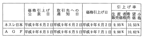 | インスタントコーヒーの平成6年における国内総供給価額は1596億円で あり,上位3社の市場占拠率の合計は84.6%である。主要事業者は,ネス レ日本株式会社(以下「ネスレ日本」という。)及び味の素ゼネラルフー ヅ株式会社(以下「AGF」という。)であり,首位事業者はネスレ日本 である。 ネスレ日本が平成9年6月2日から,AGFが同年7月1日からそれぞ れ実施したインスタントコーヒーの販売価格の引上げは,独占禁止法第18 条の2に規定する価格の同調的引上げに該当すると認められたので,当委 員会は,同年10月14日,これら2社に対して価格引上げの理由の報告を求 めた。 |