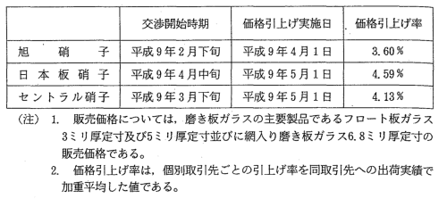 | 磨き板ガラスの平成6年における国内総供給価額は1219億円であり,上 位3社の市場占拠率の合計は96.6%である。主要事業者は,旭硝子株式会 社(以下「旭硝子」という。),日本板硝子株式会社(以下「日本板硝子」 という。)及びセントラル硝子株式会社(以下「セントラル硝子」とい う。)の3社(以下「3社」という。)であり,首位事業者は旭硝子であ る。 旭硝子が平成9年4月1日から,日本板硝子及びセントラル硝子が同年 5月1日からそれぞれ実施した磨き板ガラスの販売価格の引上げは,独占 禁止法第18条の2に規定する価格の同調的引上げに該当すると認められた ので,当委員会は,同年11月25日,これら3社に対して価格引上げの理由 の報告を求めた。 |