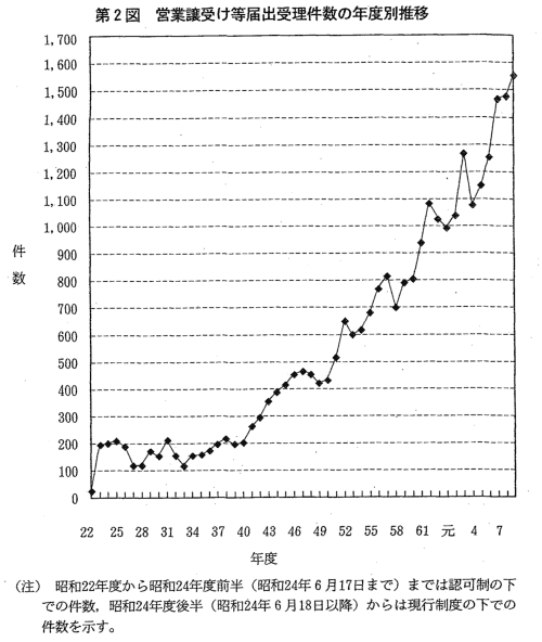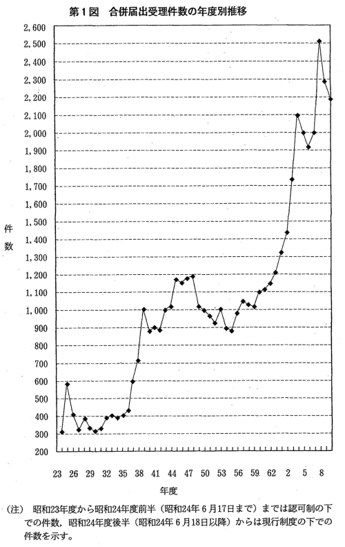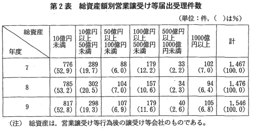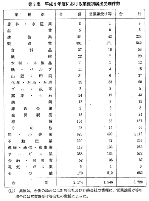 | 合併の届出受理件数は,昭和55年度(961件)から増加傾向を示し,平 成3年度において2,000件を超え,平成7年度には2,520件と過去最高の件 数となったが,その後やや減少している。平成9年度は,2,174件で,過 去第3位の件数であった(第1図)。 また,営業譲受け等の届出受理件数は,昭和40年度(202件)から増加 傾向を示しており,平成9年度は1,546件と約7倍になり,過去最高の件 数となった(第2図)。 平成9年度に届出を受理した合併・営業譲受け等を総資産額別,業種 別,形態別,様式別にみると,次のとおりである(第1表,第2表,第3 表。なお,合併・営業譲受け等についての詳細な統計については,附属資 料5-2以下参照。)。 |