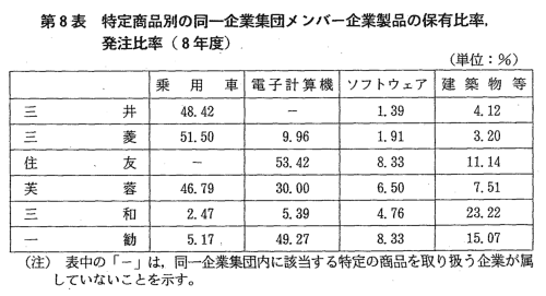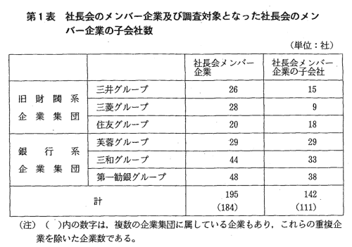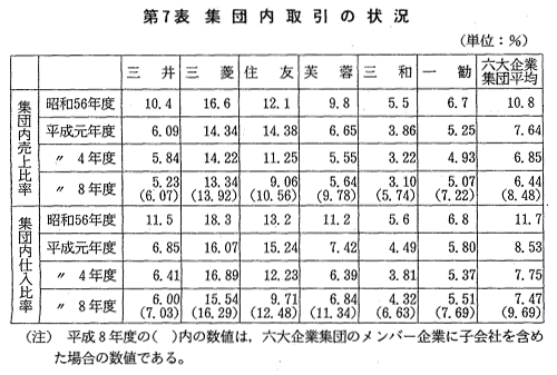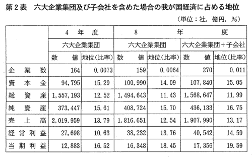 | 我が国において企業集団あるいは企業グループといわれるものは種々あ るが,三井,三菱及び住友(旧財閥系企業集団)並びに芙蓉,三和及び第 一勧銀(銀行系企業集団)の各グループについては,その規模,影響力等 から,特に六大企業集団と呼ばれている。 当委員会では,六大企業集団が我が国経済に占める地位,企業集団メン バー間の資本的・人的な結び付きの状況や取引状況等の実態及び動向を把 握するため,昭和52年以降,継続的に調査を行ってきている。 また,近年では,企業集団については系列問題の一つとして取り上げら れているところである。 このような状況の中で当委員会は,競争政策の観点から,六大企業集団 の我が国経済に占める地位,メンバー企業の集団としての結び付きの状況 及び企業集団とそのメンバー企業の最近の活動状況を把握することを目的 として,本調査を実施し,平成10年10月,調査結果を公表した。 |