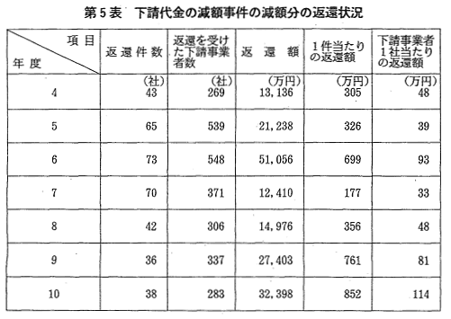 2398万円が283社の下請事業者に返還されている(第5表)。 |