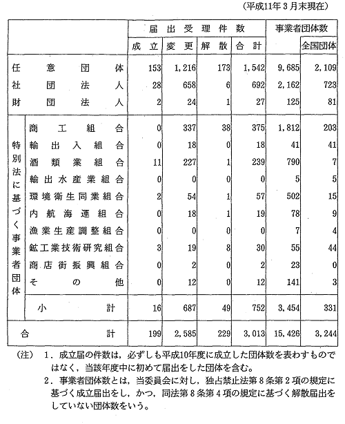 根拠法別事業者団体届出受理件数及び事業者団体数