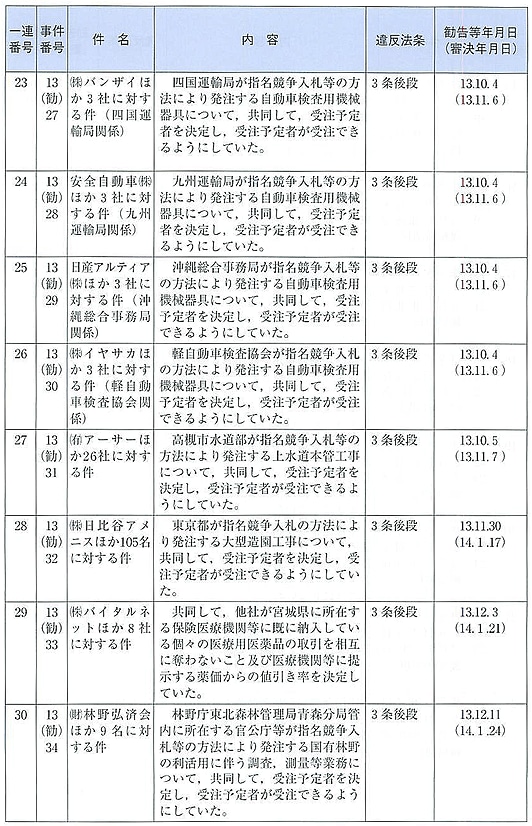![]() ![]() ![]() ![]() ![]() ![]() (注1)一連番号3の事件について,4社が勧告を応諾しなかったので,これら4社については平成13年6月27日に審判開始決定が行われている。