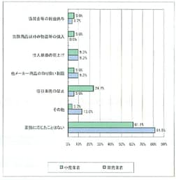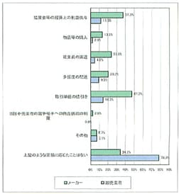 ブランド力を背景としたメーカーからの要請については,全体として,応じている企業は少なく,特に,卸売業者は応じている割合が少ない。しかし,数は少ないものの,応じた要請の中には,場合によっては再販売価格維持行為や排他条件付取引として独占禁止法上問題となるおそれのある行為も含まれている(図7)。