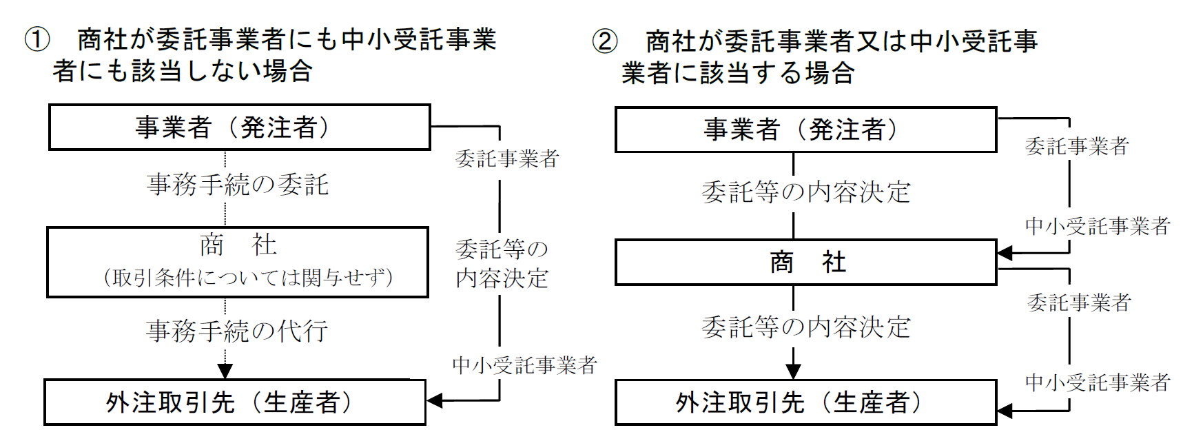 商社が本法の資本金基準又は従業員基準を満たす発注者と外注取引先の間に入って取引を行うが、製造委託等の内容(製品仕様、中小受託事業者の選定、代金の額の決定等)に全く関与せず、事務手続の代行(注文書の取次ぎ、代金の請求、支払等)を行っているにすぎないような場合、その商社は本法上の委託事業者又は中小受託事業者とはならず、発注者が委託事業者、外注取引先が中小受託事業者となる。したがって、委託事業者は商社と外注取引先との間の取引内容を確認し、本法上の問題が生じないように商社を指導する必要がある。
